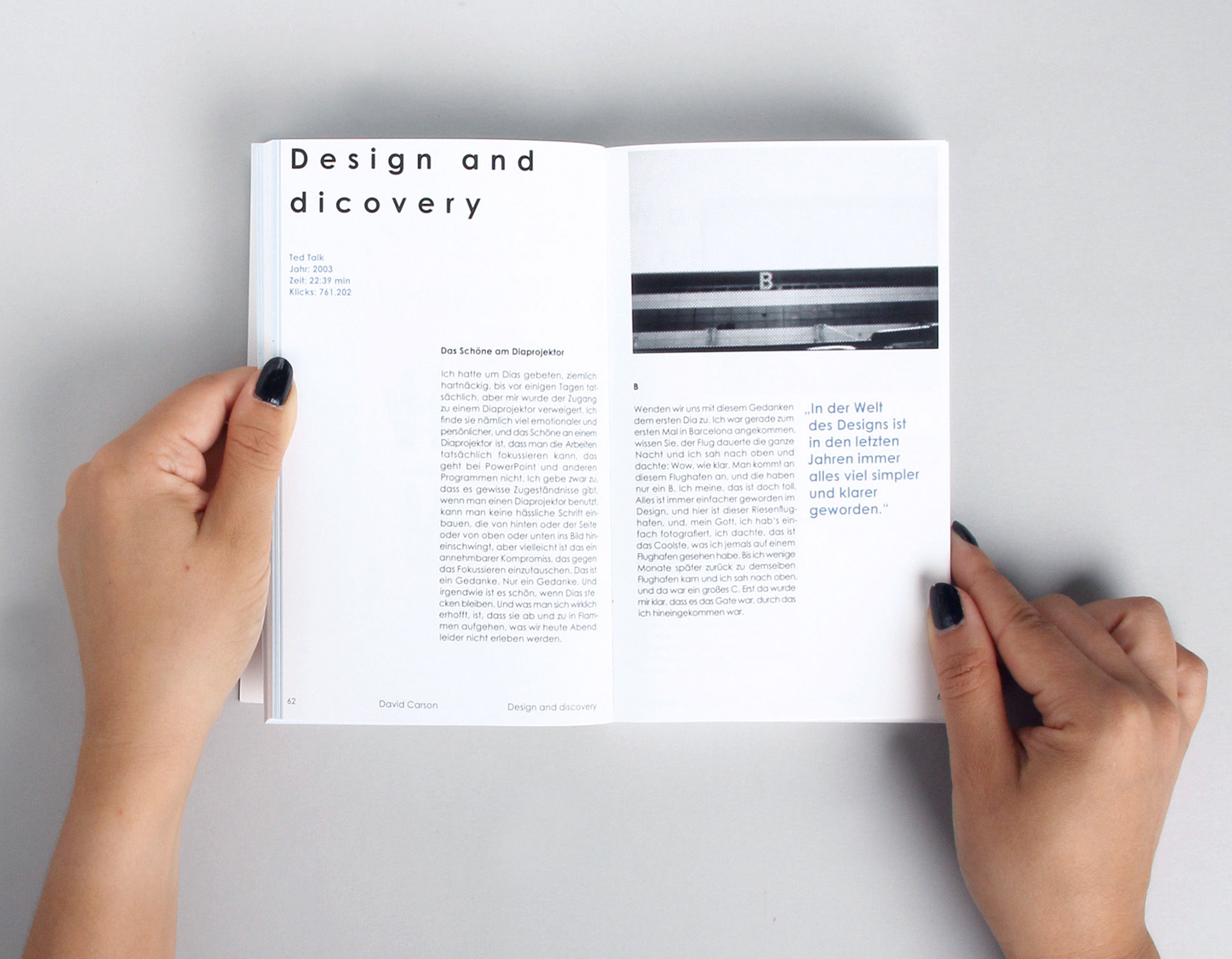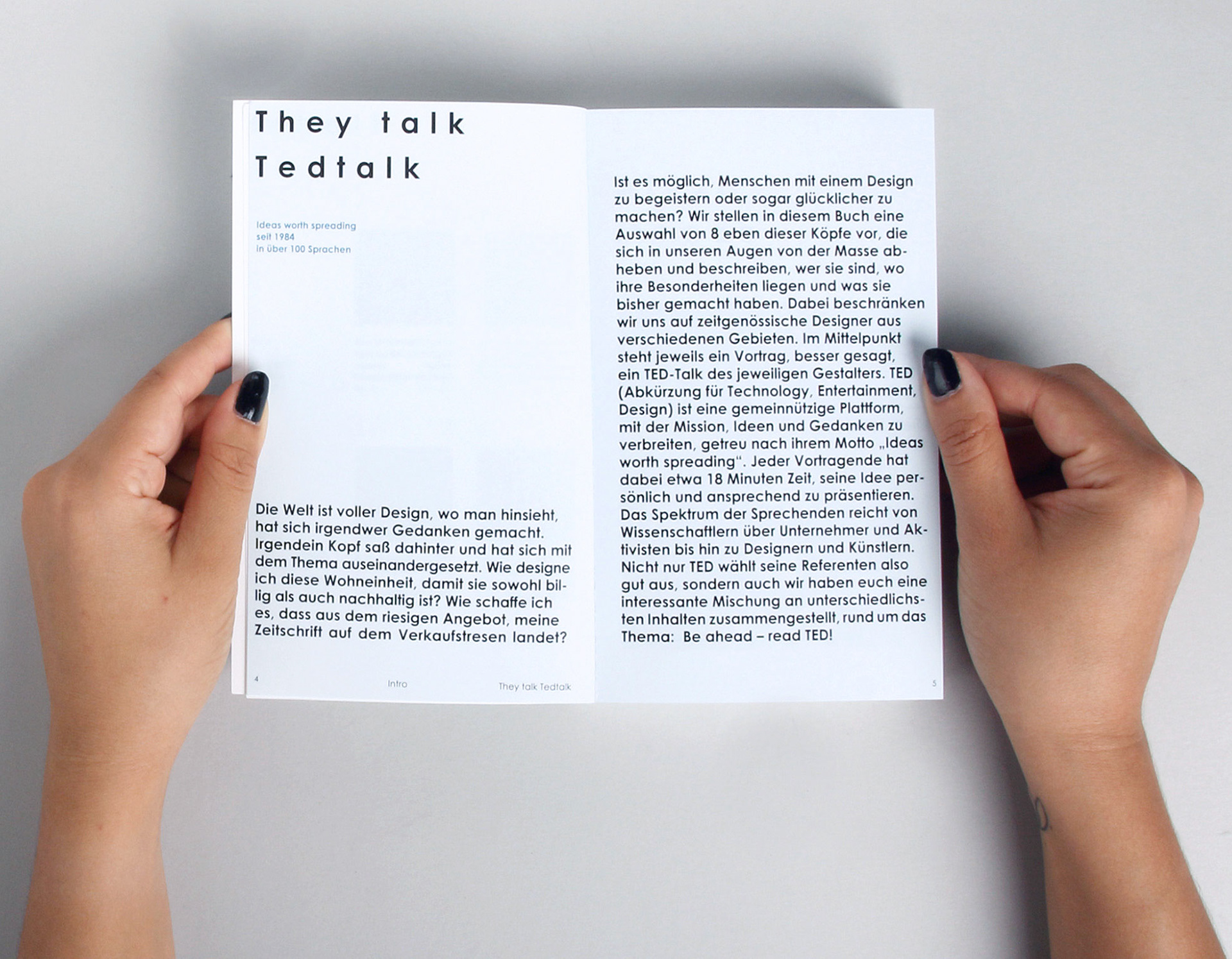 Be ahead – read Ted ist eine Dokumentation über 8 kreative Köpfe, darunter Stefan Sagmeister, Chip Kidd, David Carson und Philipp Starck. Dokumentiert wird der jeweilige Ted-Talk der Designer. Neben den Vorträgen gibt es zu jedem Designer noch weitere interessante Informationen, wie die Biografie und weitere Arbeiten.