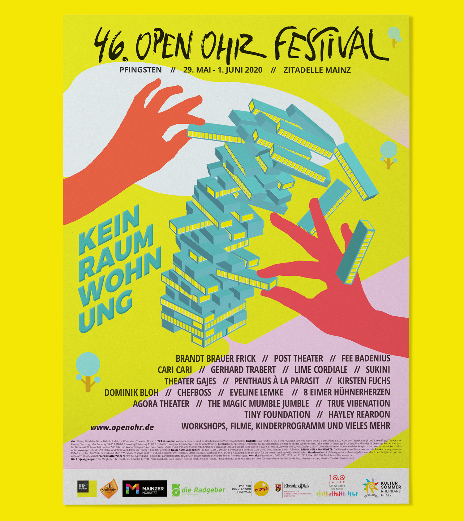 Unter dem Motto Keinraumwohnung wollte das Open Ohr Festival 2020 Themen wie Wohnraummangel und existenzielles Recht auf Wohnen in den Vordergrund bringen. Dafür wurde ein Posterwettbewerb ausgeschrieben den ich gewonnen habe. Leider konnte das Festival wegen der Covid-19-Pandemie nur digital stattfinden.