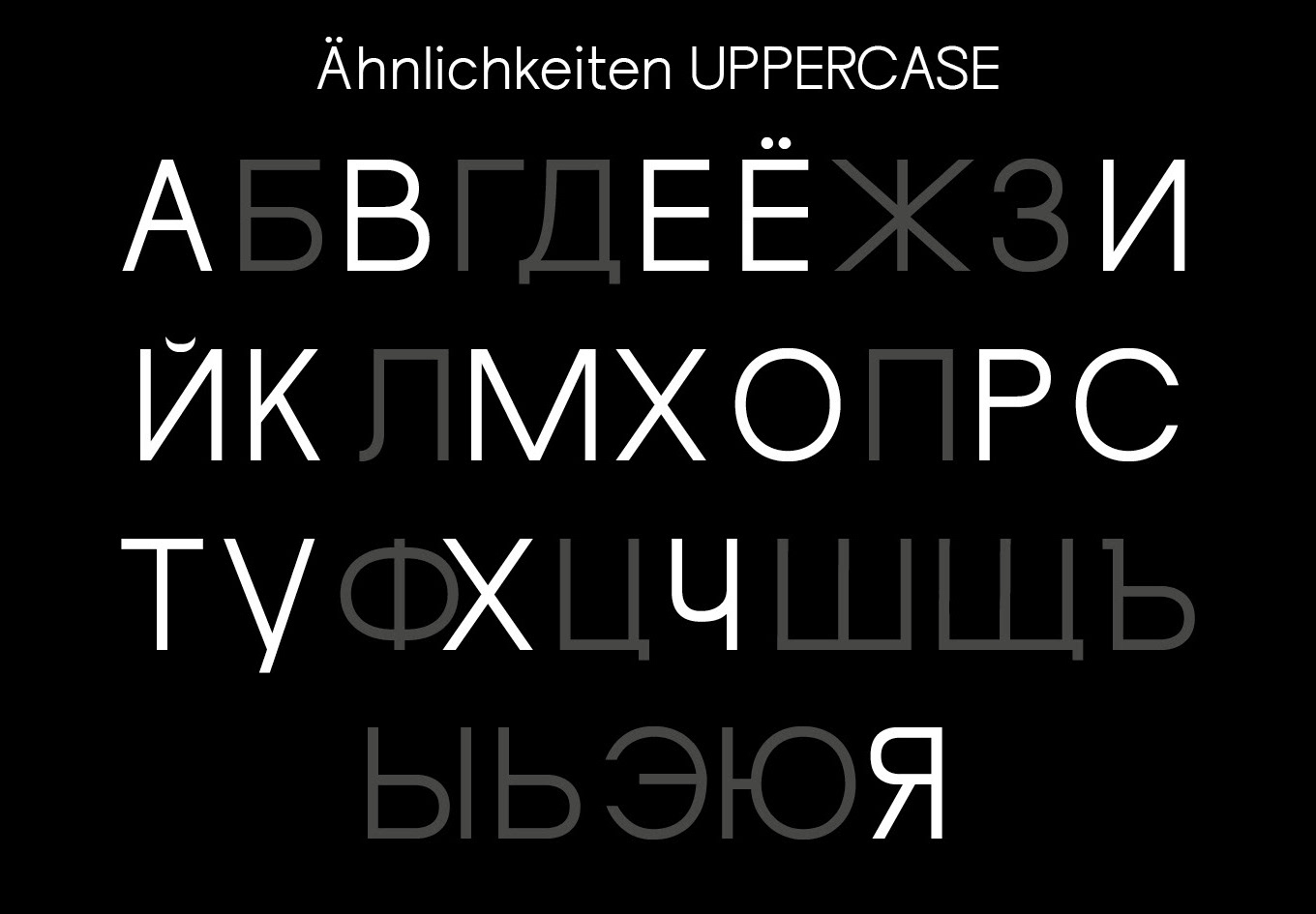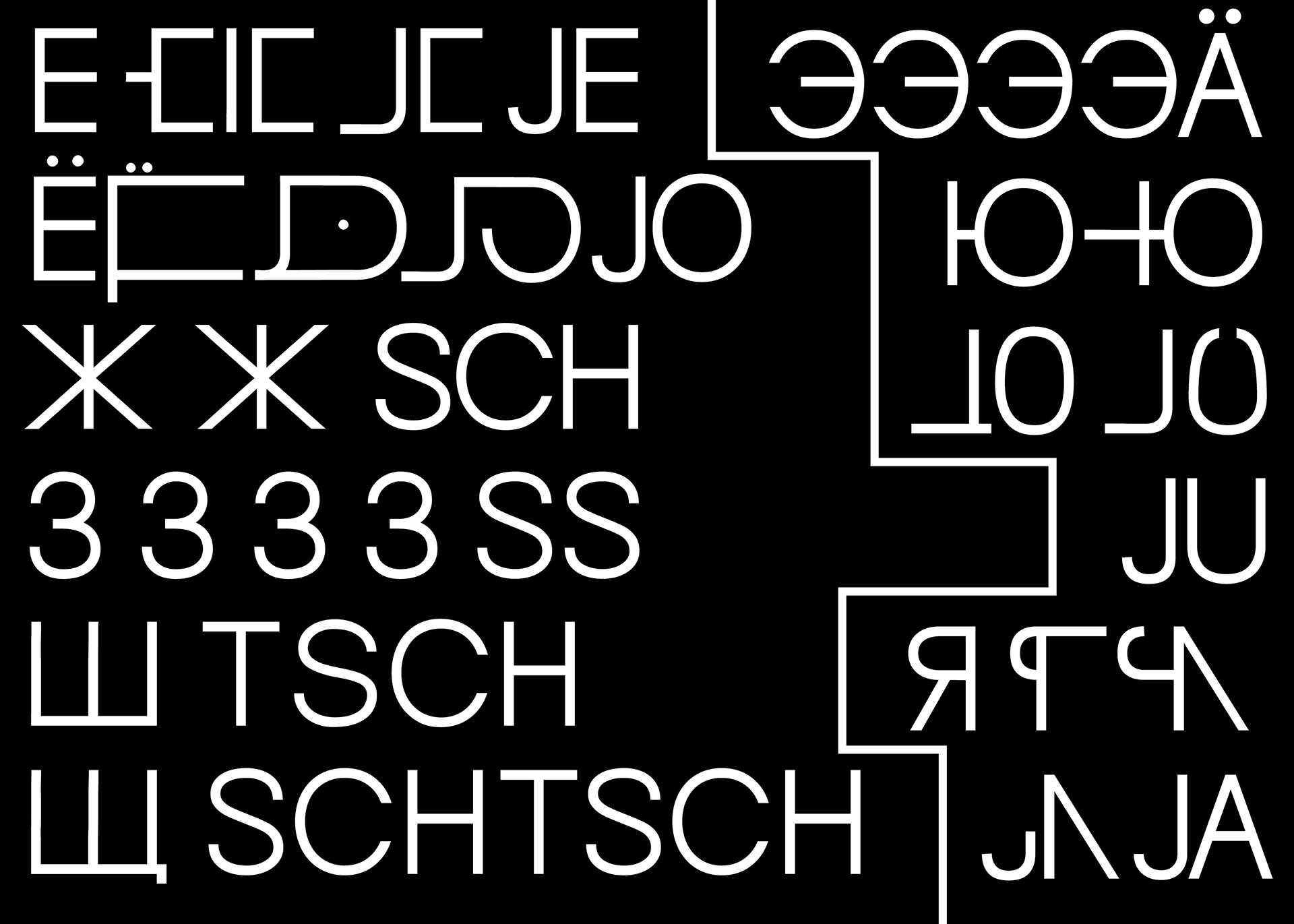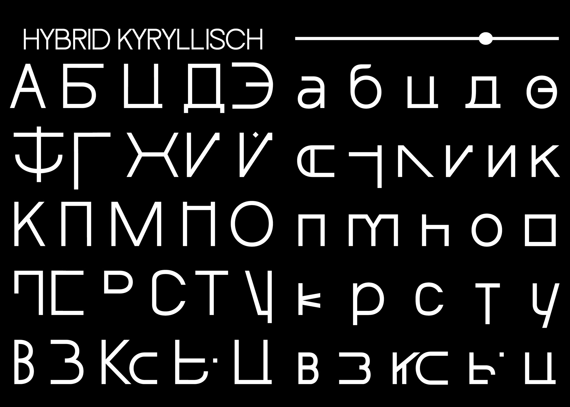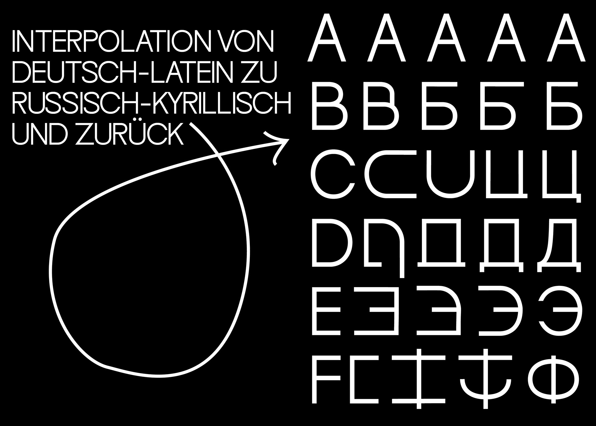 Diese “fusionierte Sprache" hat mich dazu inspiriert eine deutschrussische variable Font zu entwerfen, die auf ihren Achsen zwischen dem deutsch-lateinischen und russisch-kyrillischen Schriftsystem interpoliert und jeden einzelnen Letter in das eine oder das andere Schriftsystem phonetisch korrekt übersetzt. Durch die Interpolation von dem einen in das andere Schriftsystem entstehen Hybride Letter, die die fusionierte Sprache darstellen.