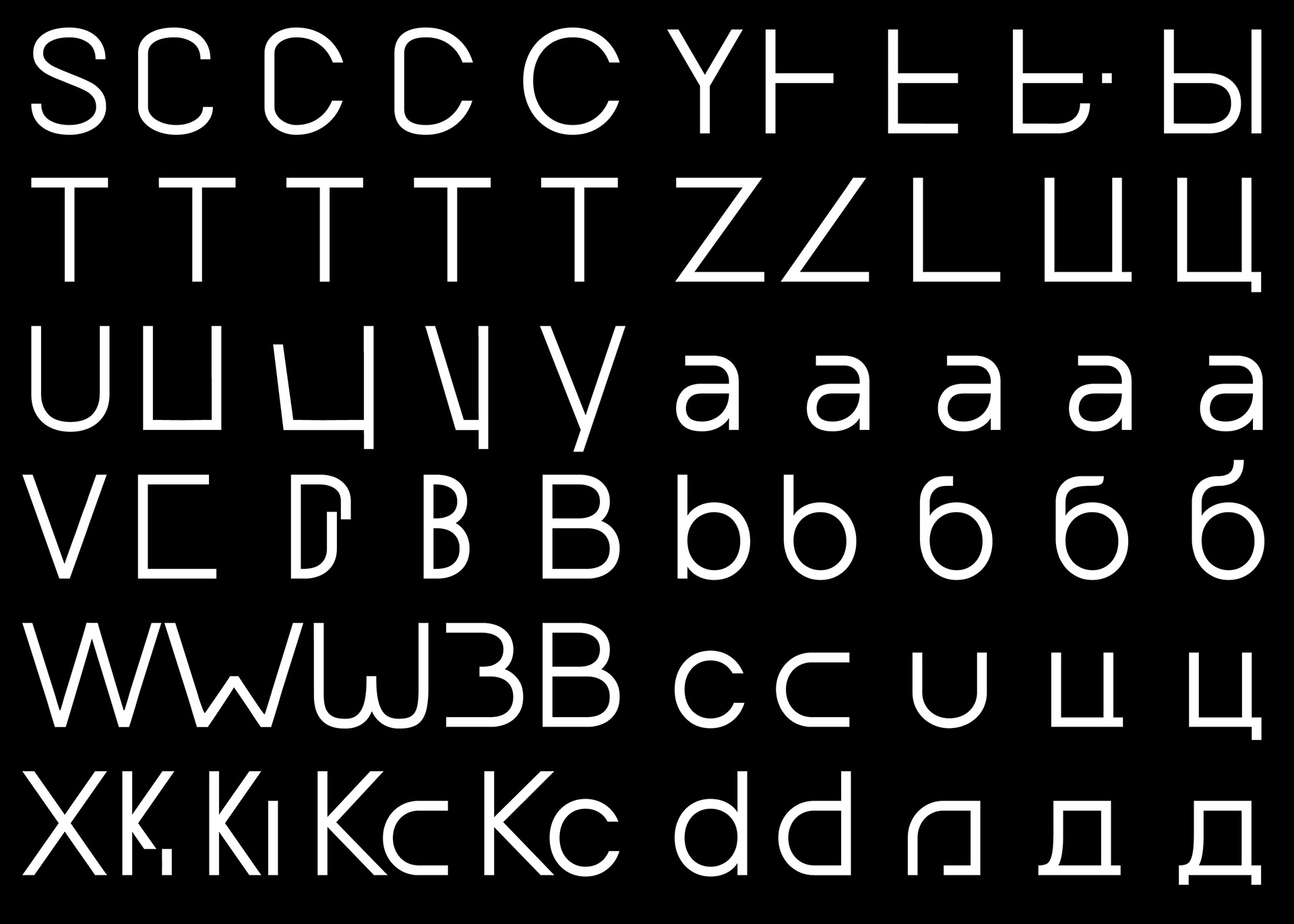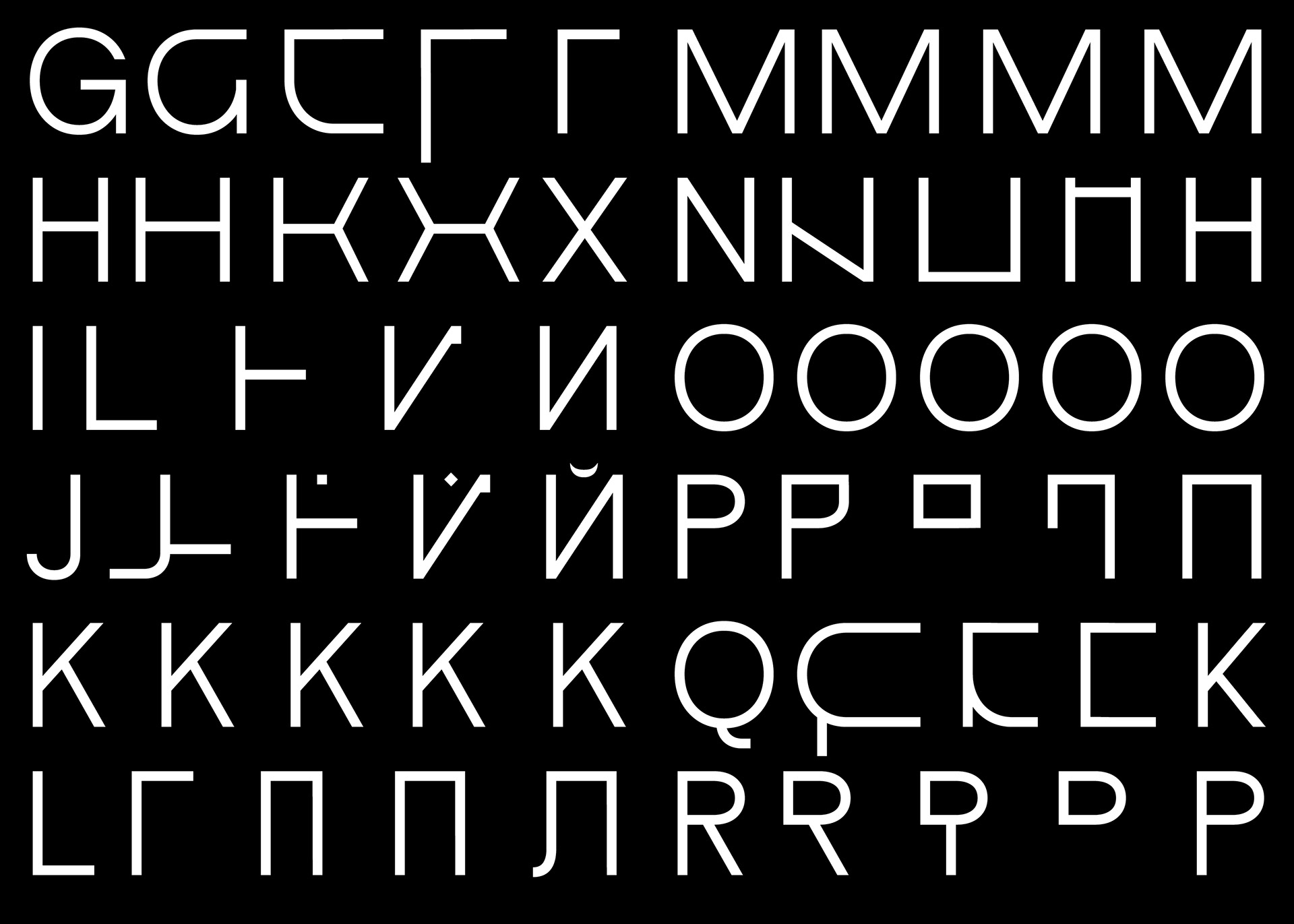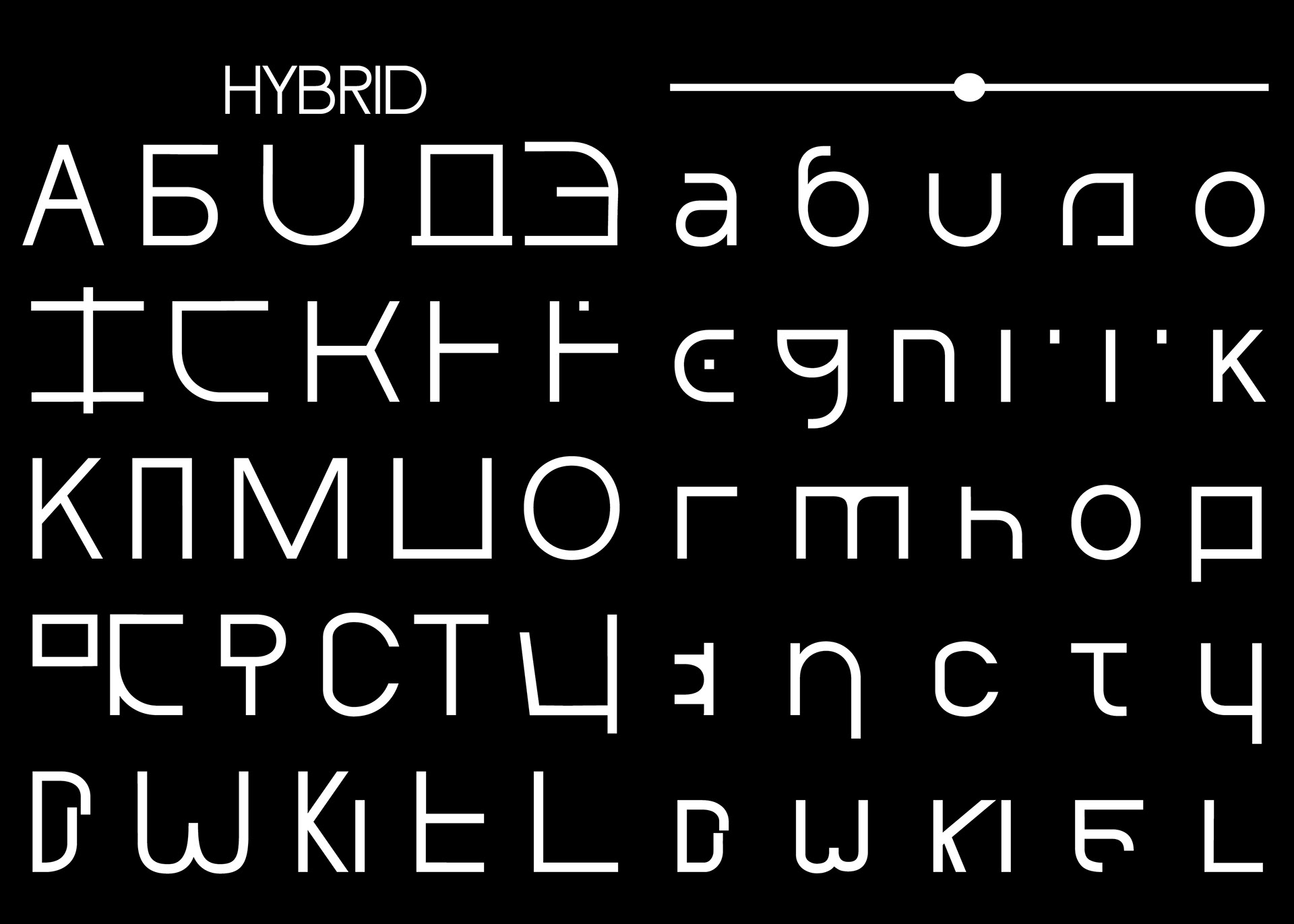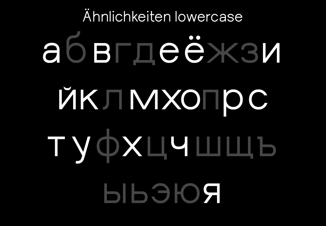 Diese “fusionierte Sprache" hat mich dazu inspiriert eine deutschrussische variable Font zu entwerfen, die auf ihren Achsen zwischen dem deutsch-lateinischen und russisch-kyrillischen Schriftsystem interpoliert und jeden einzelnen Letter in das eine oder das andere Schriftsystem phonetisch korrekt übersetzt. Durch die Interpolation von dem einen in das andere Schriftsystem entstehen Hybride Letter, die die fusionierte Sprache darstellen.