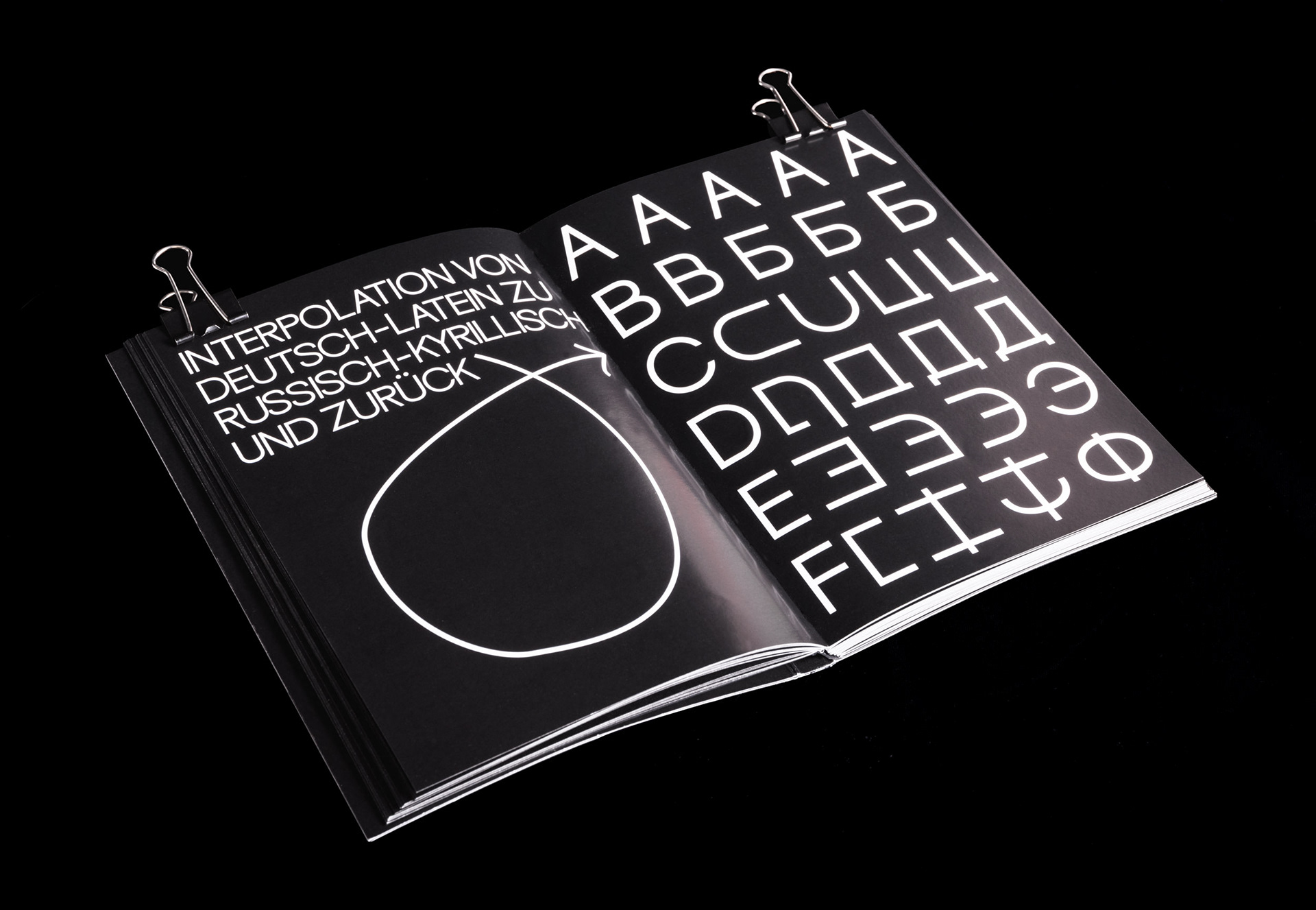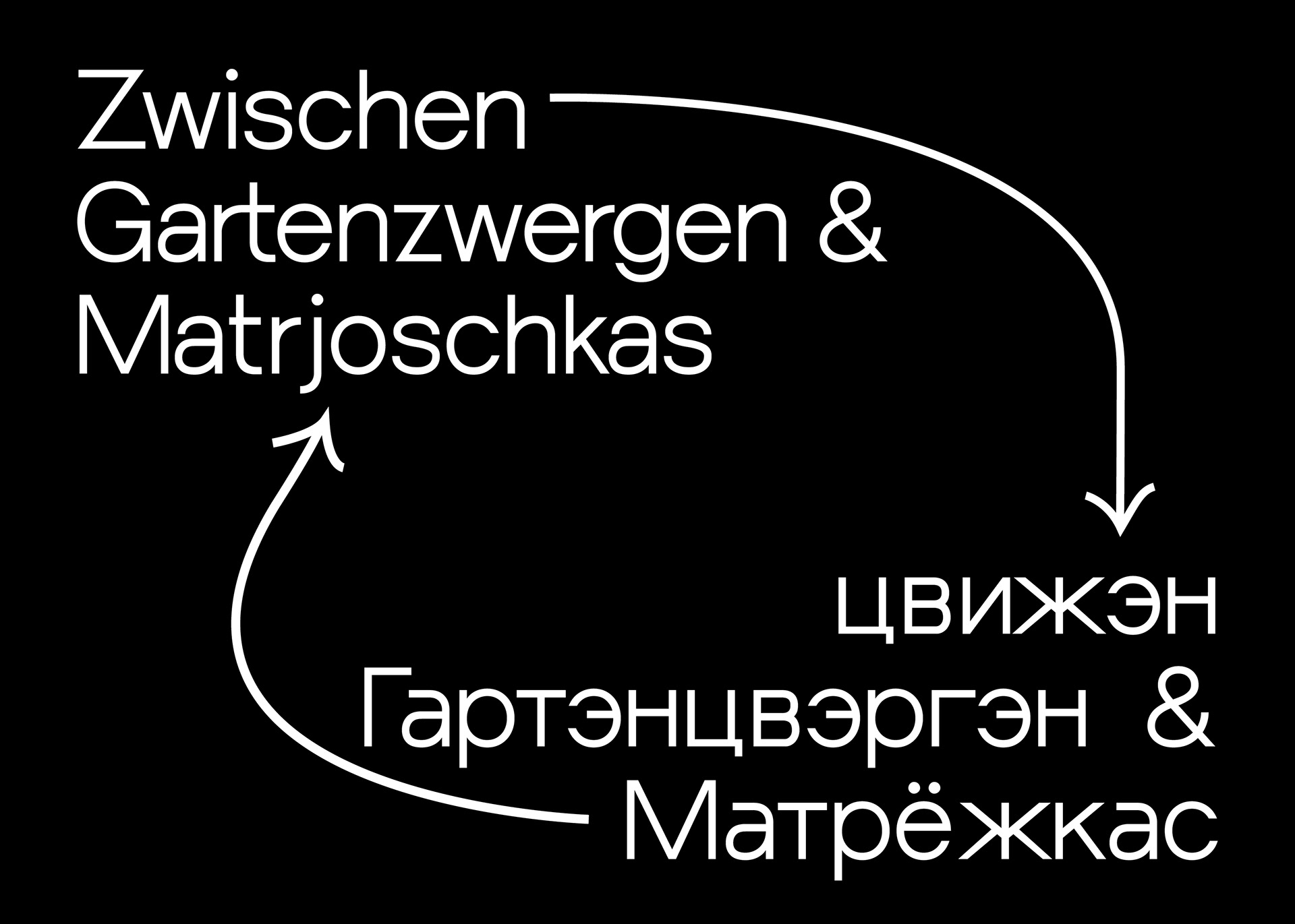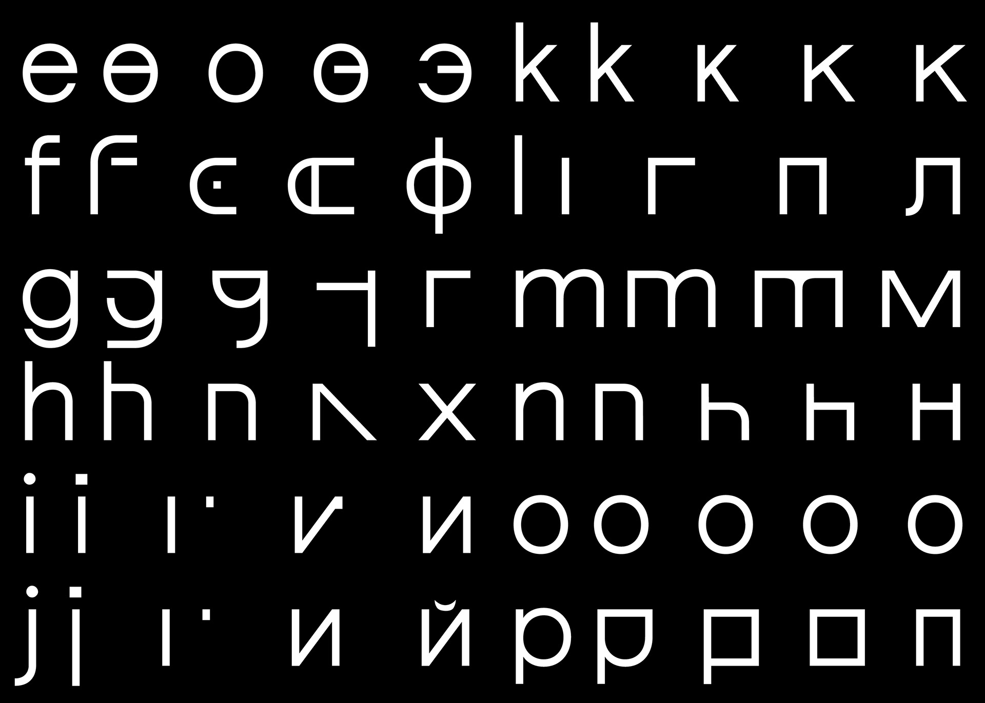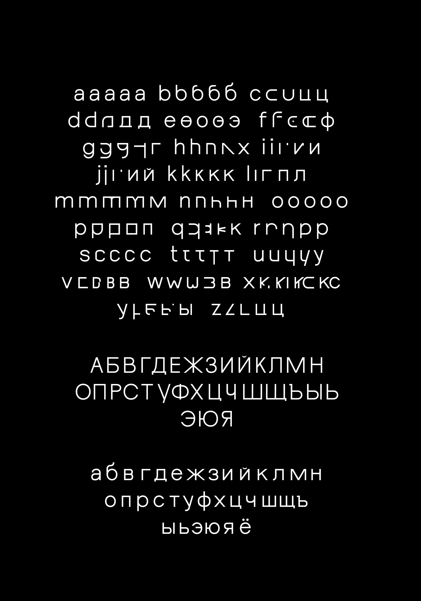 Diese “fusionierte Sprache" hat mich dazu inspiriert eine deutschrussische variable Font zu entwerfen, die auf ihren Achsen zwischen dem deutsch-lateinischen und russisch-kyrillischen Schriftsystem interpoliert und jeden einzelnen Letter in das eine oder das andere Schriftsystem phonetisch korrekt übersetzt. Durch die Interpolation von dem einen in das andere Schriftsystem entstehen Hybride Letter, die die fusionierte Sprache darstellen.