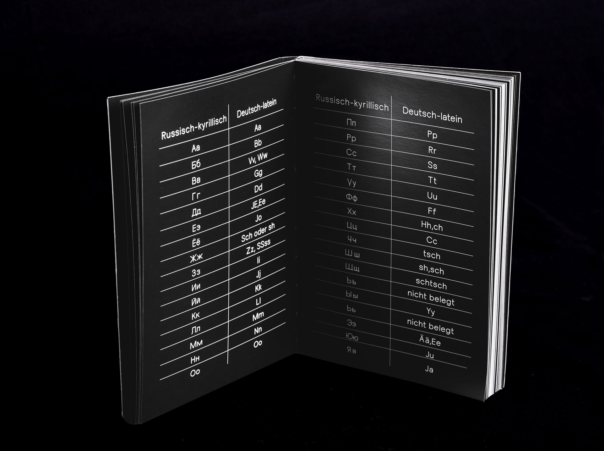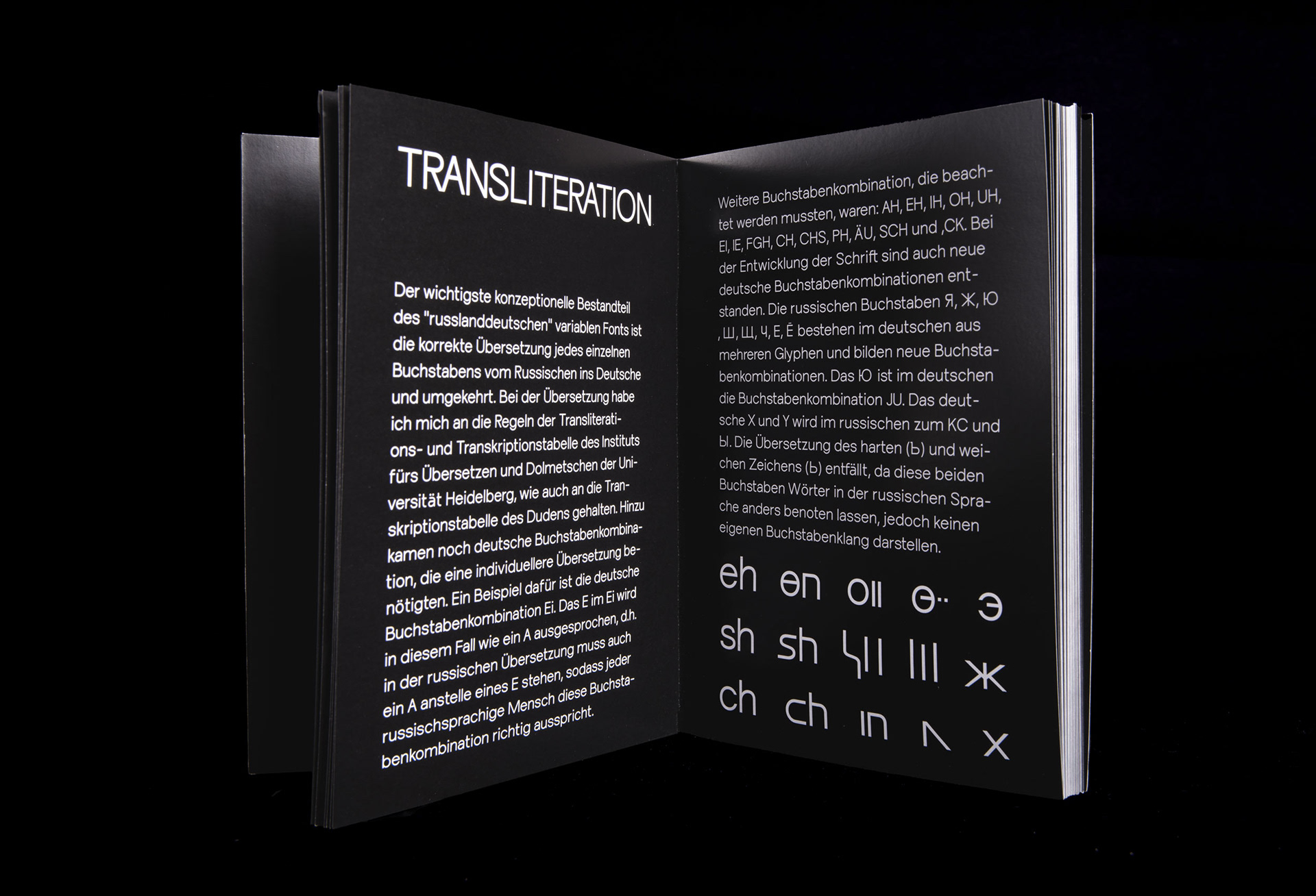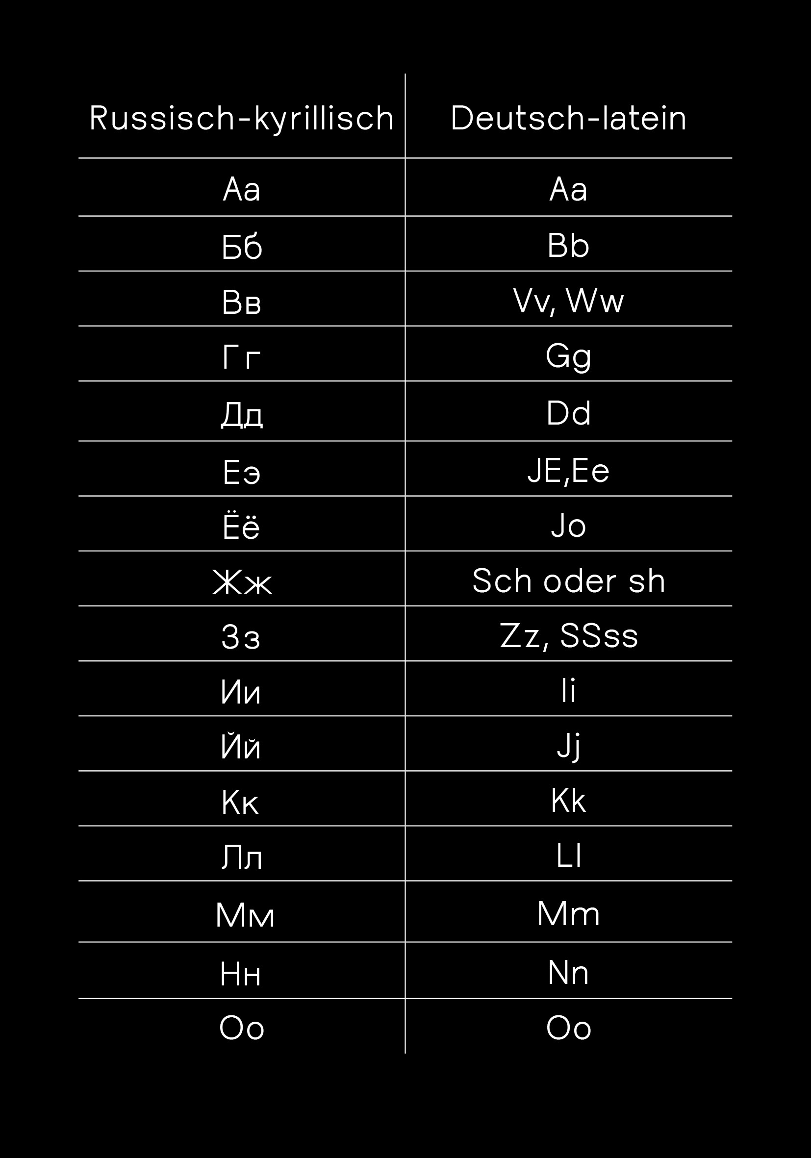 Der wichtigste konzeptionelle Bestandteil des "russlanddeutschen" variablen Fonts ist die korrekte Übersetzung jedes einzelnen Buchstabens vom Russischen ins Deutsche und umgekehrt. Bei der Übersetzung habe ich mich an die Regeln der Transliterations- und Transkriptionstabelle des Instituts fürs Übersetzen und Dolmetschen der Universität Heidelberg, wie auch an die Transkriptionstabelle des Dudens gehalten.